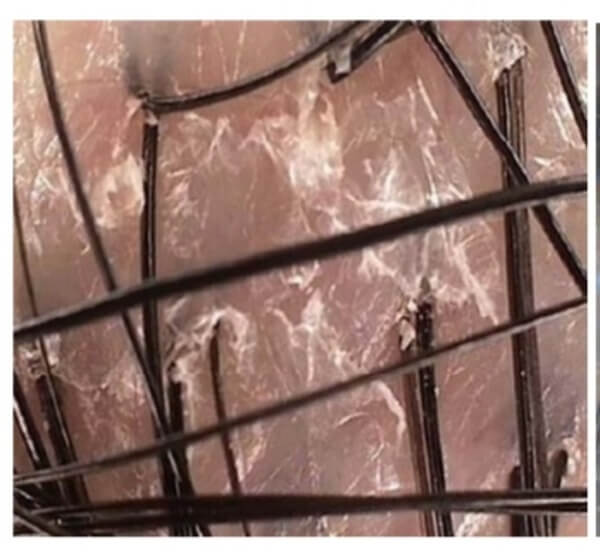 수분 증발과 피지 분비 장애 등으로 판상형 모양의 각질이 모공 주변과 윤곽선을 막아 모공 형태가 불분명한 상태를 띠며 모발 굵기에 있어 연모화(머리카락이 가늘어지는 현상)를 촉진하나 수적인 부분에는 크게 변화는 없다