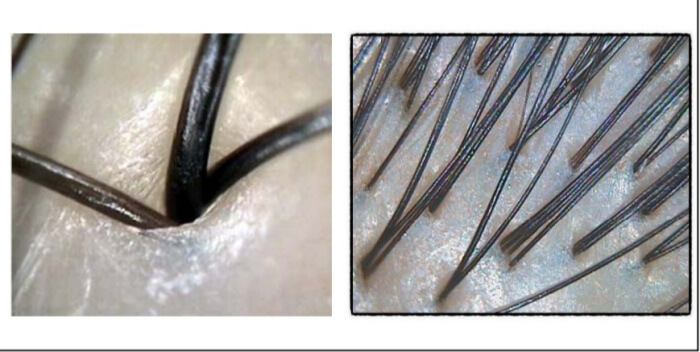 한 개의 모공에 2~3개의 모발이 건강하게 자리 잡고 있으며 모발의 굵기는 약간 차이가 있거나 거의 비슷한데 탈모가 이미 진행 중인 두피나 진행된 두피 같은 경우는 한 개의 모공에 1~2가닥의 머리털이 있거나 이때 모발이 같이 있어도 굵기의 차이를 느낄 수 있다